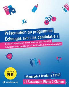 Découvrez le programme du PLR Montreux pour 2026-2031, échangez avec les candidates et candidats pour la Municipalité et le Conseil communal.